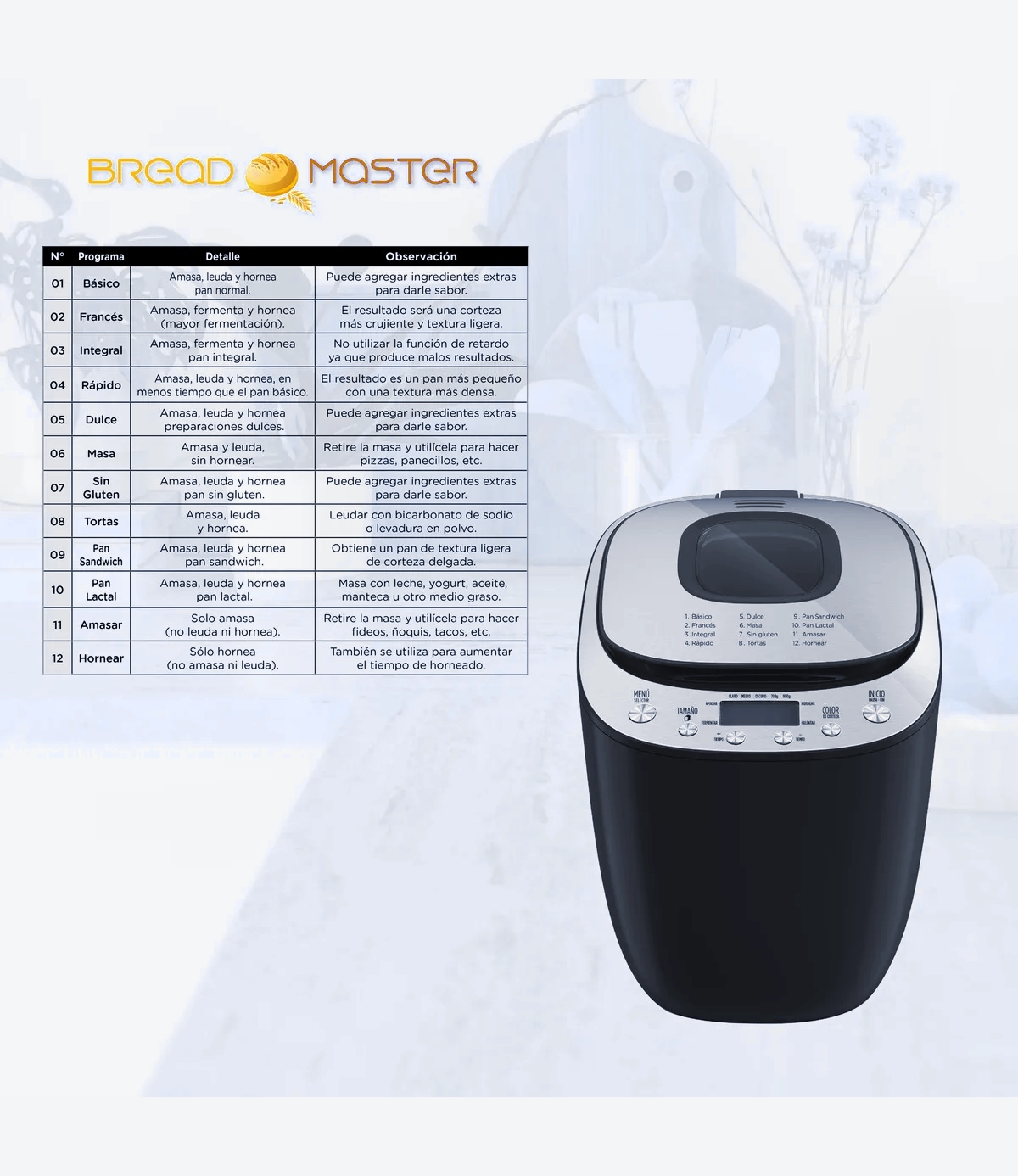 • Menú de 12 programas: Pan básico, Francés, Integral,